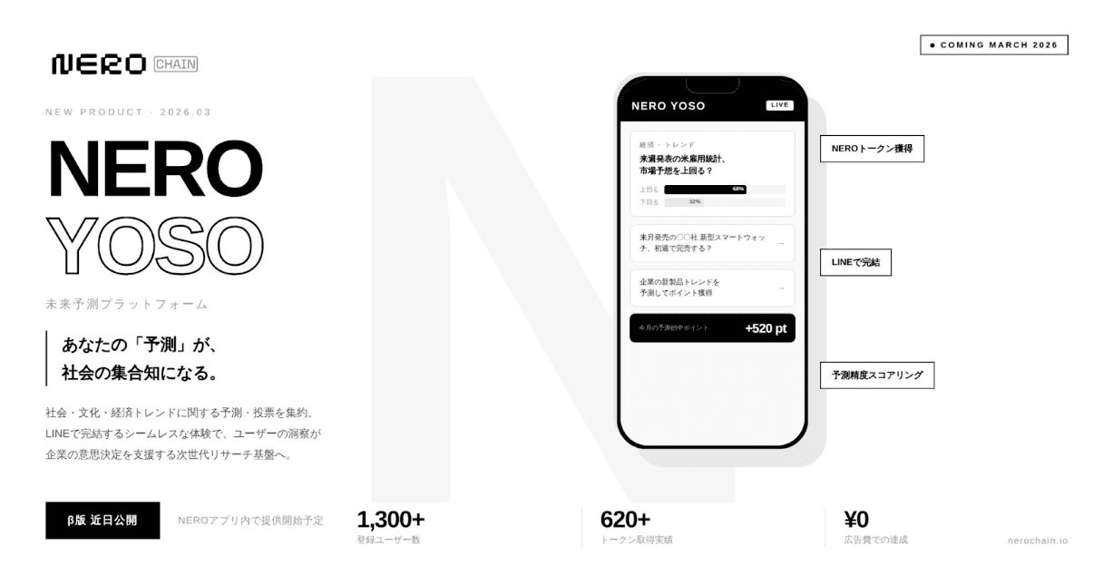 NERO Chain、未来予測プラットフォーム「NERO YOSO」を発表 — LINE公式アカウント登録者1,300名超の「ポイ活」経済圏を活用し、企業向けマーケティング連動型の予測データ活用を推進 —